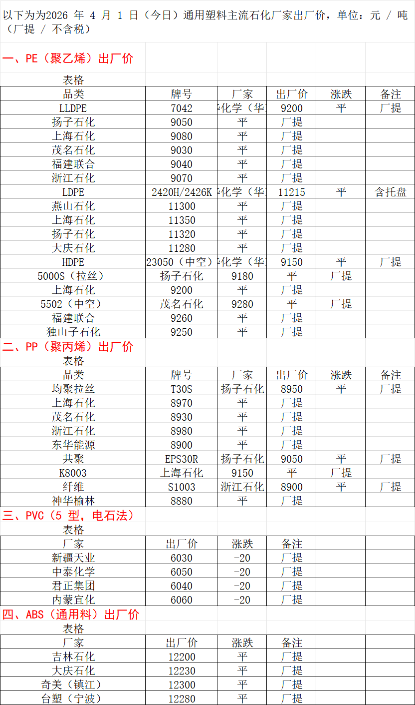 2026年4月1 CRA塑料企业市场报价