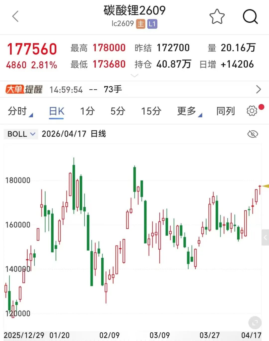 近期,碳酸锂期货价格持续上移,连续6个交易日收涨。4月17日,LC2609合约价格报收177560元/吨,上涨2.81%,再次逼近180000元/吨重要关口。