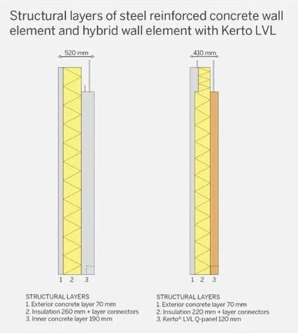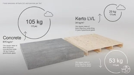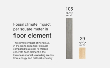 而在墙体结构中,两者的差异表现为: Kerto LVL 的化石气候影响(单位:CO₂e/m²,二氧化碳当量 公斤/平米)为 52 kg CO₂e/m²,钢筋混凝土为 68 kg CO₂e/m²。 材料使用量(单位kg/m²,公斤/平米)分别为 60 kg/m² 与 463 kg/m²,Kerto LVL 减少了超过80%的材料重量。