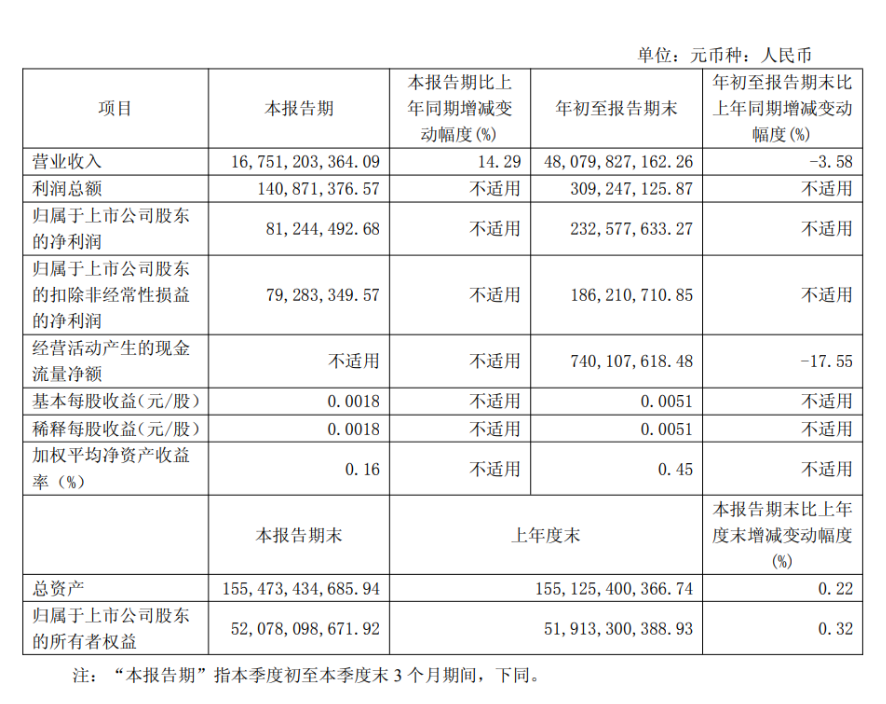 包钢股份发布的三季报显示:2025年第三季度实现营业收入167.51亿元,同比增长14.29%;归属于上市公司股东的净利润8124.45万元;基本每股收益0.0018元。前三季度实现营业收入480.8亿元,同比下降3.58%;归属于上市公司股东的净利润2.33亿元,上年同期净亏损5.16亿元;基本每股收益0.0051元。